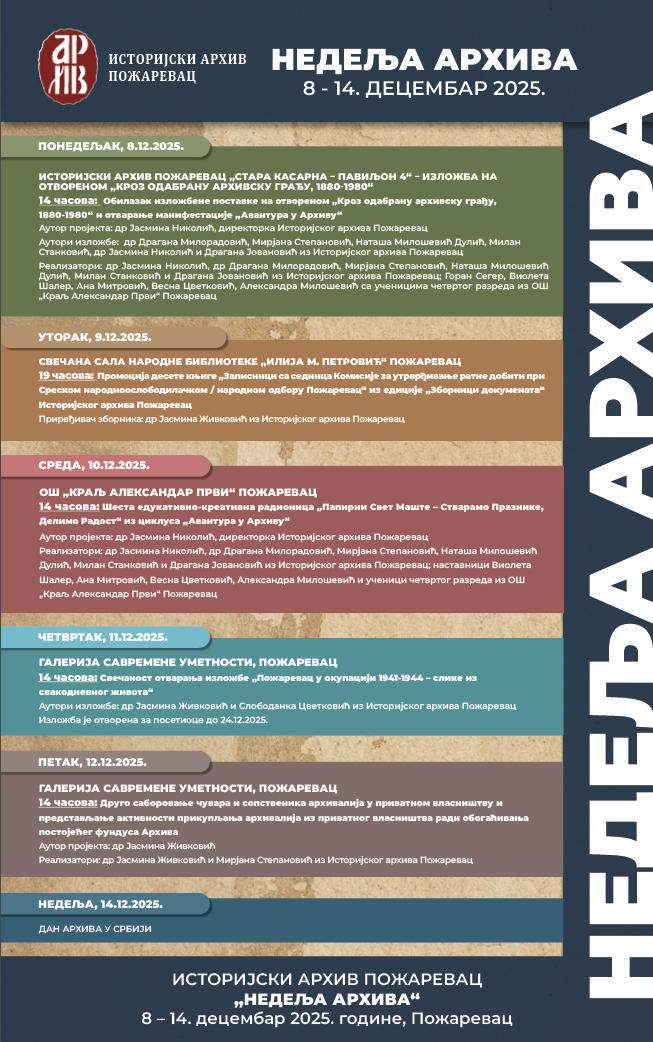Од 8. до 14. децембра у Историјском архиву Пожаревац је одржана "Недеља архива" са различитим активностима. Погледајте плакат