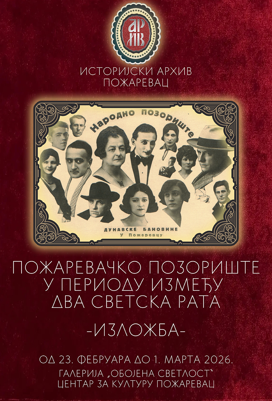 Изложба Историјског архива Пожарева "Пожаревачко позириште у периоду између два светска рата", ауторке Слободанке Цветковић, биће пред посетиоцима од 23. фебруара до 1. марта 2026. године у Галерији "Обојена светлост" Центра за културу Пожаревац. Изложба ће бити постављена као пратећа манифестација поводом XXII фестивала "Миливојв штап и шешир" - сусрети варошких позоришта Србије. Погледајте плакат